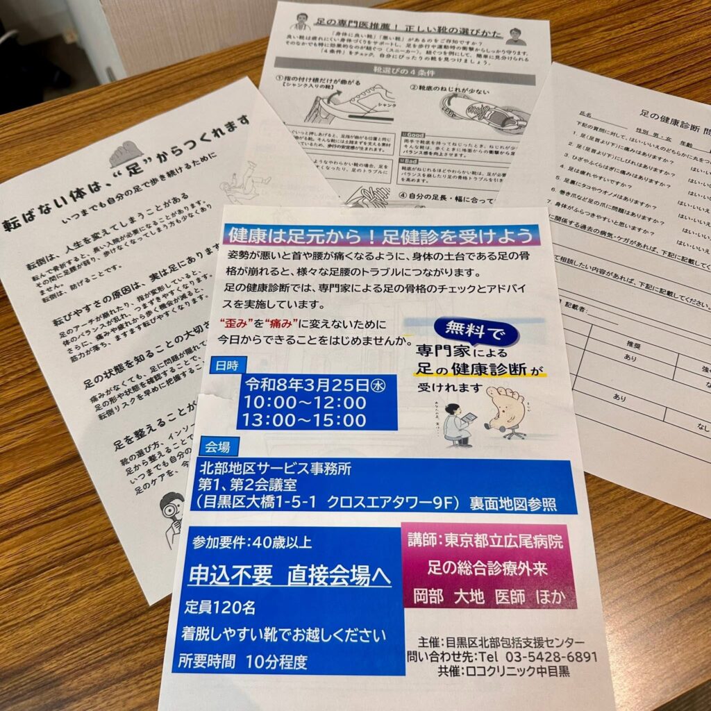 足の総合診療医・岡部先生(ヘルスケアジャパン代表)、都立広尾病院、目黒区北部包括支援センターと協力し、目黒区初の足健診👣を開催しました。